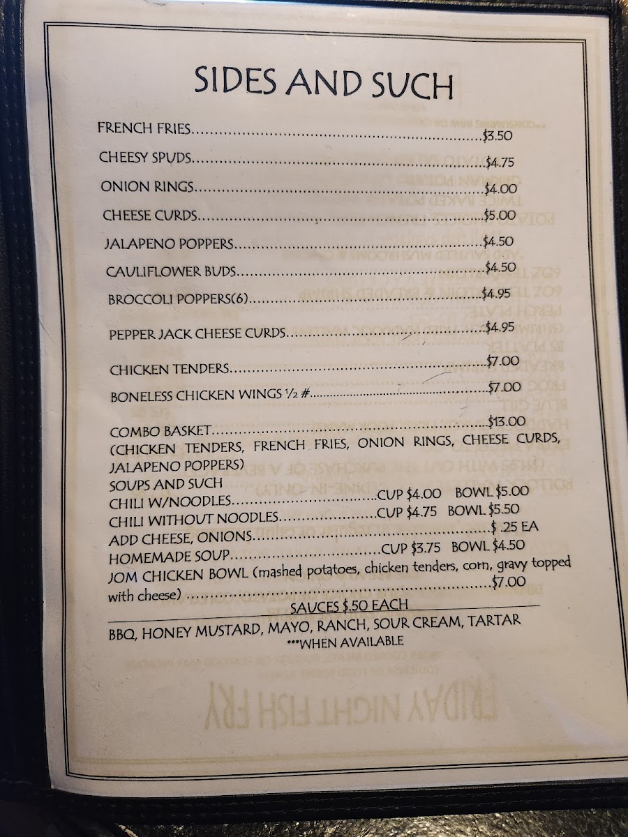 Start with their mouthwatering side orders like crispy cheese curds and flavorful jalapeno poppers. The Friday Night Fish Fry stands out, offering an exceptional range of options including AYCE Pollock and tender Bluegill, all served with homemade coleslaw and tasty potatoes.